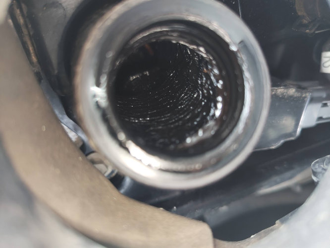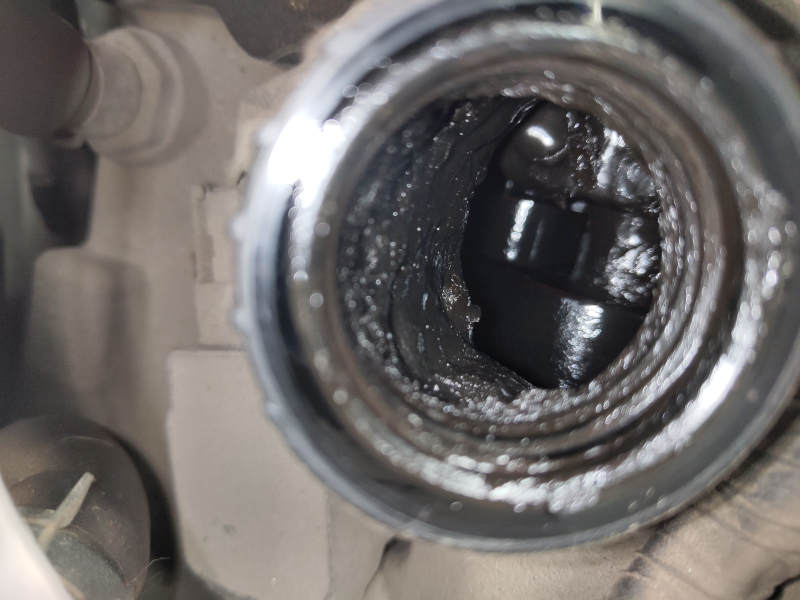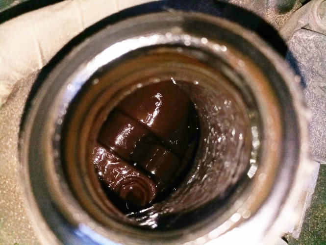 В результате многократных локальных перегревов блока цилиндра и как следствие выхлопной трассы (привет причинно следственная связь с разрушением верхних катализаторов) некоторые моторы могут внутри выглядеть как на фото в заголовке. Как правило заглянув в верхнюю масляную галерею через маслозаливную горловину можно увидеть залежи “гуталина”, но самое страшное обычно не сверху, а снизу в поддоне или в середине в масляных каналах. Иногда на таких моторах бывает достаточно посмотреть на щуп, который будет окрашен в коричневый цвет более чем полностью, т.е. во всю длину.
